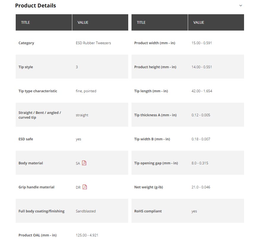 Diese Präzisionspinzette eignen sich für heikle Anwendungen, bei denen es darauf ankommt, kleine Bauteile fest zu halten und gleichzeitig eine gute Sicht zu gewährleisten. Der ESD-Gummigriff verleiht der Pinzette ESD-Eigenschaften in Kombination mit einem ergonomischen Griff für die Handhabung von elektronischen Bauteilen und für den Einsatz in Reinräumen.
