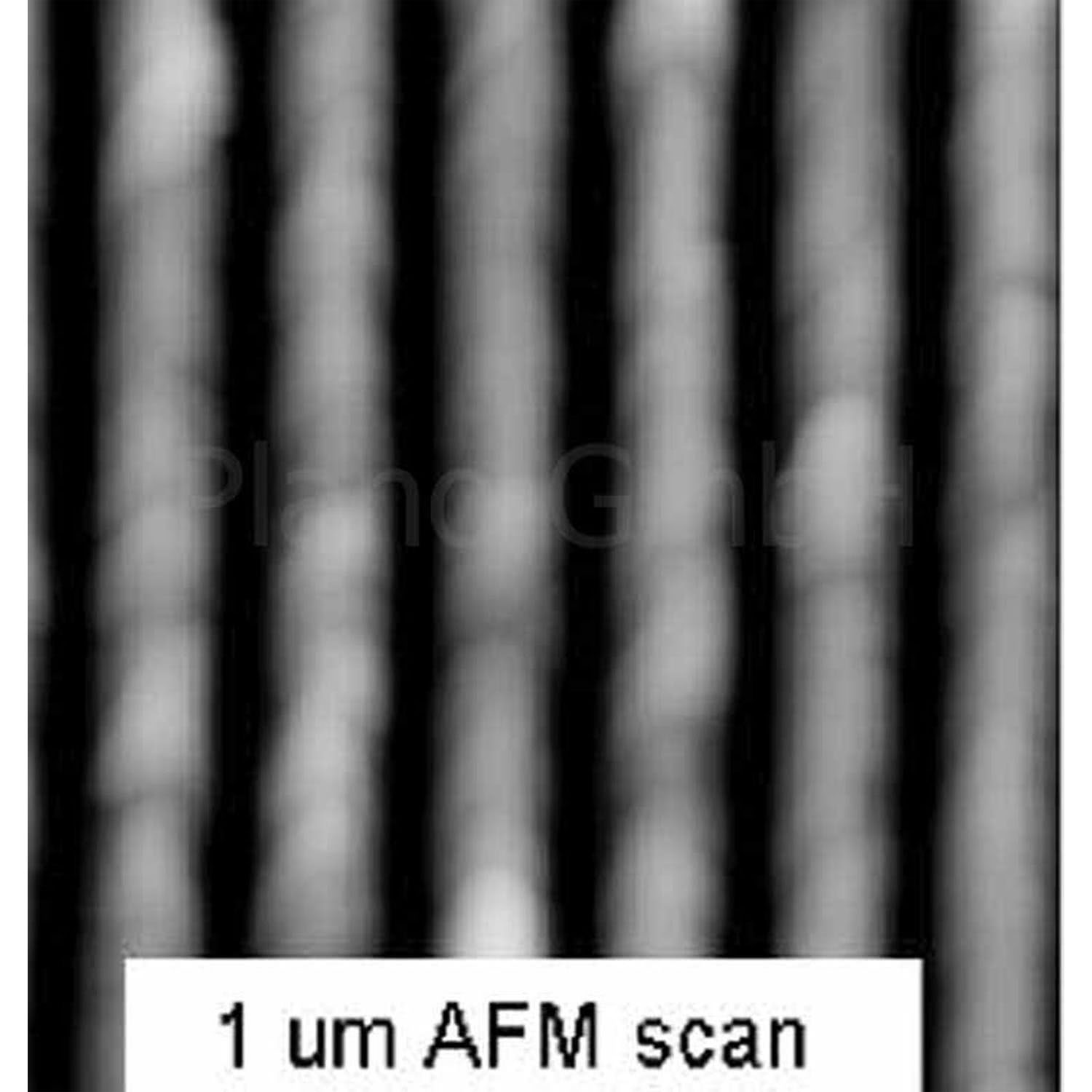 Die Aluminium-Linien auf einem Glassubstrat (4 mm x 6 mm) mit periodischen Strukturen von nominal 145 nm wurden mit holographischen Methoden hergestellt. Die genauen Maße liegen jedem Testobjekt bei. Die Linien-Höhe beträgt ca. 100 nm, die Linienbreite beträgt ca. 75 nm (beide Maße sind nicht kalibriert). Der Bereich mit dem Muster bedeckt den gesamten Standard und erlaubt somit sehr viele Messungen, ohne dass ein Bereich wiederholt verwendet werden muss, der durch eine Messung evtl. beschädigt wurde. Die Genauigkeit der Maße beträgt ± 1 nm. Wird für AFM benötigt und ist für Kontakt-, Tapping- und weitere AFM-Methoden anwendbar, bei Bildgrößen von 250 nm bis 10 µm.