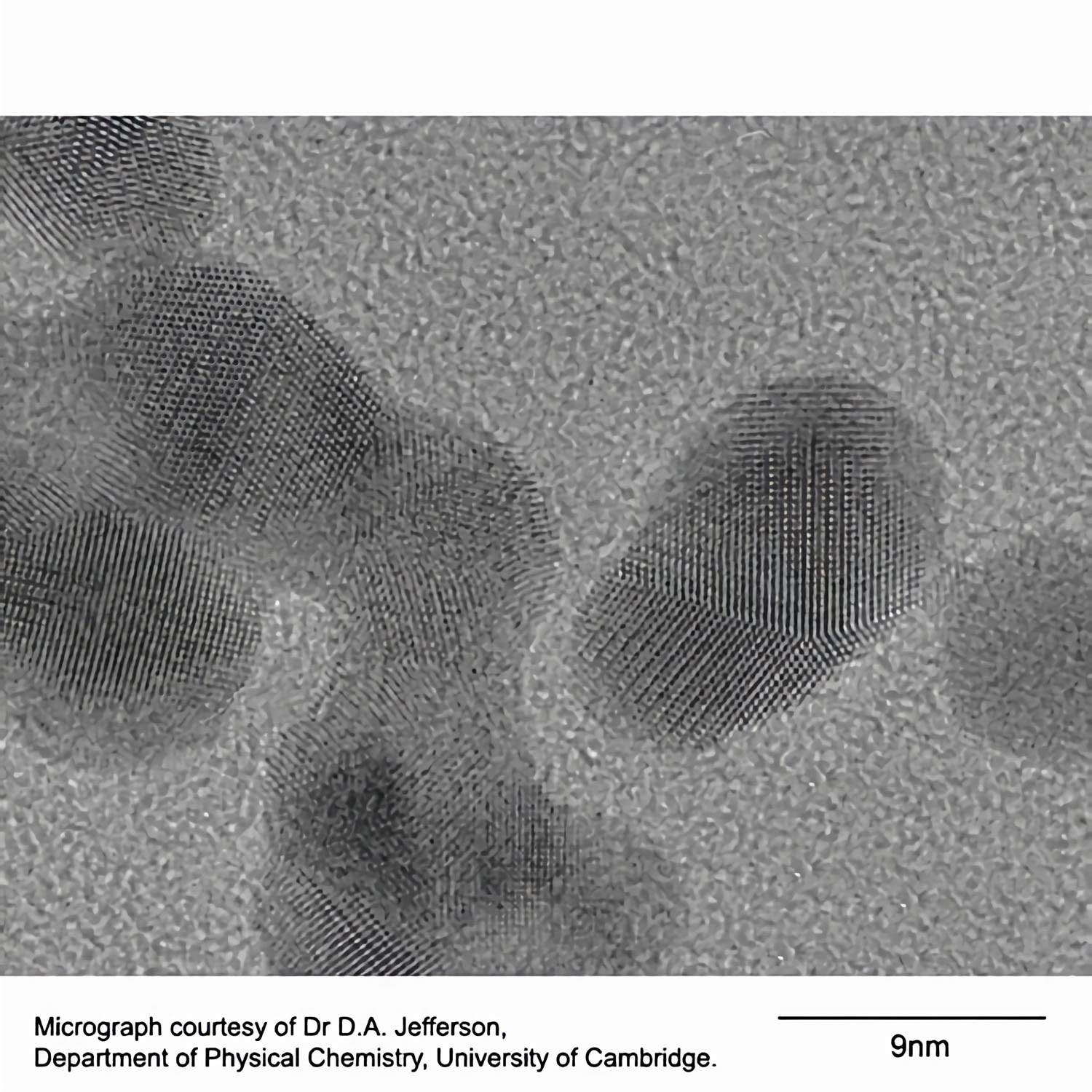 Diese Zusammenstellung fein verteilter, dünner Goldteilchen leistet für den Test der Hochauflösungseigenschaften eines TEM einen weiteren Beitrag. Während die Verwendung der einkristallinen Goldfolie (S135) die oben genannten Gerätekriterien erfasst, ist dieses Testobjekt mit Goldteilchen bei der Bestimmung der Auflösung überlegen. Es weist ohne oder mit geringer Kippung eine Auswahl an Kristallorientierungen auf. Außerdem läßt sich die Dicke des kristallinen Materials anhand der projektierten Form des Goldkristalls leicht ausrechnen. Das aus der Struktur des Trägerfilms resultierende Untergrundrauschen hilft bei der Bestimmung der Betriebstransferfunktionen.