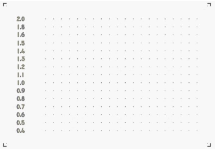 Die Probe weist synthetische Partikel auf, die zeilenartig angeordnet sind. Jede Zeile besteht aus 20 Partikeln, die 150 µm Abstand aufweisen und somit eine äquidistante Matrix ergeben. Die entsprechende Partikelgröße ist jeweils am Zeilenbeginn angegeben.